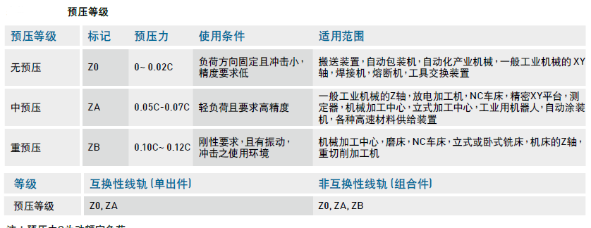 A、無預壓:標示為Z0;預壓力為 0~ 0.02C ;使用條件:負荷方向固定且沖擊小,精度要求低;適合范圍:搬送裝置,自動包裝機,自動化產業機械,一般工業機械的 XY軸,焊接機,熔斷機,工具交換裝置