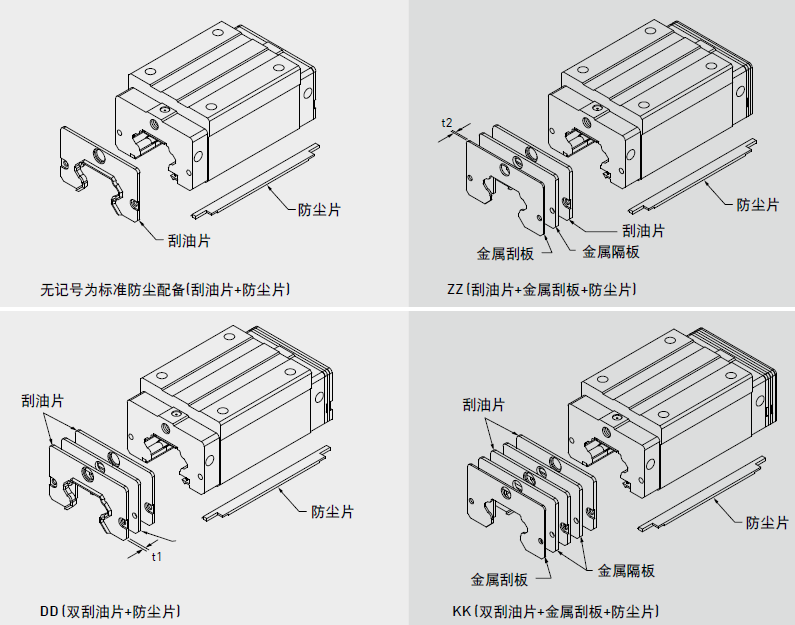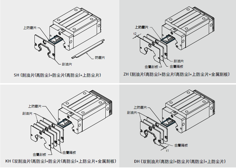 HIWIN針對較一般環境嚴苛之作業環境,開發強化高防塵功能之防塵配件,若有下列高防塵配件需求時,請于產品型號后面加注代碼。
