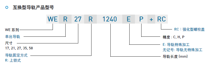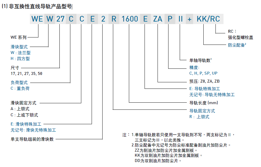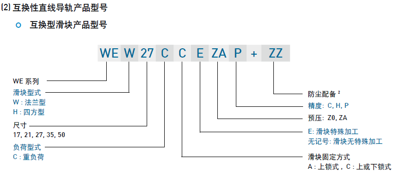 WE系列分為非互換性及互換性型兩種直線導(dǎo)軌,兩者規(guī)格尺寸相同,主要差異點(diǎn)在于互換性型之滑塊、導(dǎo)軌可單獨(dú)互換使用,較便利,但其組合精度無法達(dá)到非互換性型之超精密級(jí)以上的精度,不過由于HIWIN互換性型之組合精度目前已達(dá)到一定的水平,對(duì)不需配對(duì)安裝直線導(dǎo)軌的客戶而言,是一項(xiàng)便利的選擇。直線導(dǎo)軌的產(chǎn)品規(guī)格型號(hào)主要標(biāo)明直線導(dǎo)軌尺寸、型式、精度等級(jí)、預(yù)壓等規(guī)格要求,以利訂貨時(shí)雙方對(duì)產(chǎn)品的確認(rèn)。