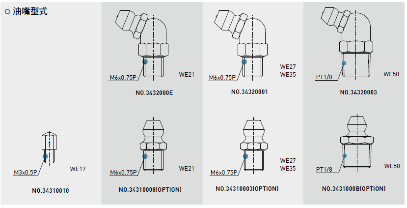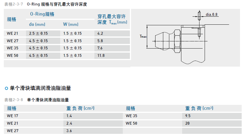 依客戶需要在滑塊前端或后端裝上油嘴以供手動打油,WE系列特別在端蓋側(cè)邊預(yù)留側(cè)油孔位置安裝油嘴(一般為直油嘴),提供側(cè)向打油,側(cè)向打油的位置建議在非側(cè)基準邊,但若有特殊需要亦可放在側(cè)基準邊。客戶如有上述側(cè)向打油需求請與我們聯(lián)絡(luò)。WE系列在端蓋頂端亦預(yù)留上油孔位置,客戶若欲從端蓋上方供油,須使用直徑0.8mm的金屬針以預(yù)熱的方式,在指定位置將上油孔穿通,再將密封環(huán)安裝于凹處即可,避免使用鉆頭穿通上油孔,碎屑有污染油道的危險。使用接管方式自動供潤滑油脂之直線導(dǎo)軌,則可依連接管型式選用安裝油管接頭。