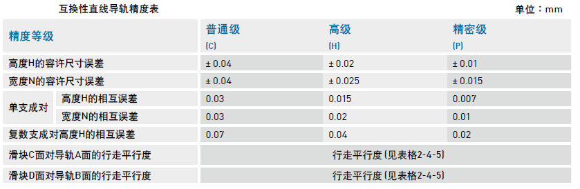 互換性直線導軌精度在滑塊組裝于單支導軌之成對高及寬度精度,同非互換性直線導軌精度,但若組裝于不同支導軌上,因導軌高度誤差,其成對高及寬度精度,比非互換性直線導軌精度稍微遜色,而行走平行度精度則同非互換性直線導軌之精度。