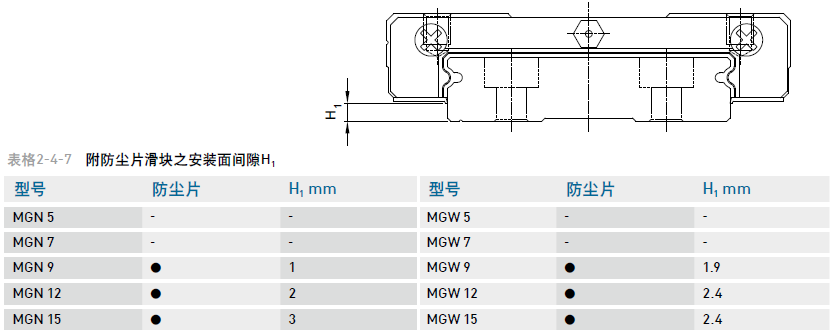 標準防塵配備滑塊兩端裝有刮油片,以阻隔粉塵或雜質進入滑塊內部,而影響直線導軌壽命及精度。防塵片是裝在滑塊底部,以防止粉塵或雜質從滑塊底部間隙進入滑塊內部,客戶若欲選用防塵片,可于型號后面加 +U 代碼。規格5、7滑塊至底部承靠面間隙 (H1) 很小,并不提供加裝防塵片,然規格9、12與15有提供防塵片選用。客戶在選用防塵片時,需注意滑塊間隙 (H1) 變小,當有側邊承靠面使用時,側邊承靠面之高度,不可大于間隙值(H1),以避免滑塊在運行時干涉到側邊承靠面。