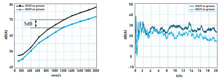 利用同步聯(lián)結(jié)器可使?jié)L珠均勻等間隔的排列,滾珠與滾珠間的相互撞擊金屬聲消失,尖銳的高頻聲音強(qiáng)度有效降低(見右下圖)。總和的聲音強(qiáng)度與舊有系列比較在各個(gè)速度域有效降低約5分貝(見左下圖)。