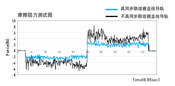 傳統(tǒng)不具同步聯(lián)結(jié)器之直線導(dǎo)軌開始運(yùn)行時(shí),負(fù)荷側(cè)的鋼珠會(huì)先運(yùn)動(dòng),再推擠方向回轉(zhuǎn)部與無(wú)負(fù)荷側(cè)內(nèi)的鋼珠,造成連鎖的來(lái)回碰撞,使得摩擦阻力變動(dòng)起伏劇烈。而采用SynchMotionTM技術(shù)的QH系列直線導(dǎo)軌由于具有同步聯(lián)結(jié)器,將同一循環(huán)內(nèi)的所有鋼珠串聯(lián)在一起,所以當(dāng)滑塊開始運(yùn)動(dòng)時(shí),所有鋼珠幾乎同時(shí)啟動(dòng),且鋼珠間并無(wú)來(lái)回的碰撞,在保持一定的運(yùn)動(dòng)慣性下,摩擦阻力的變動(dòng)幅度能有效的減少。