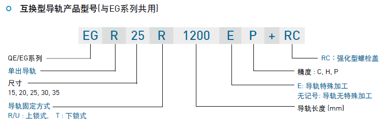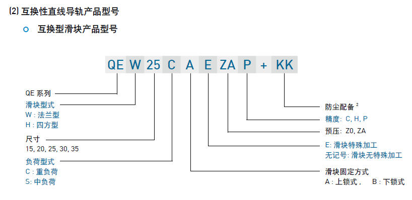 QE系列分為非互換性及互換性兩種直線導軌,兩者規格尺寸相同,主要差異點在于互換性型之滑塊、導軌可單出互換使用,較便利,但其組合精度無法達到非互換型所擁有的超高精度等級。不過由于HIWIN在制造上有良好的尺寸控制及嚴格的質量要求,互換性型之組合精度目前已達到一定的水平,對不需配對安裝直線導軌的客戶而言,是一項很好的選擇。QE系列與 EG 系列導軌共享,客戶無需為了選用靜音式產品而重新設計安裝尺寸,如此更加提升了QE系列的應用性與可互換性。