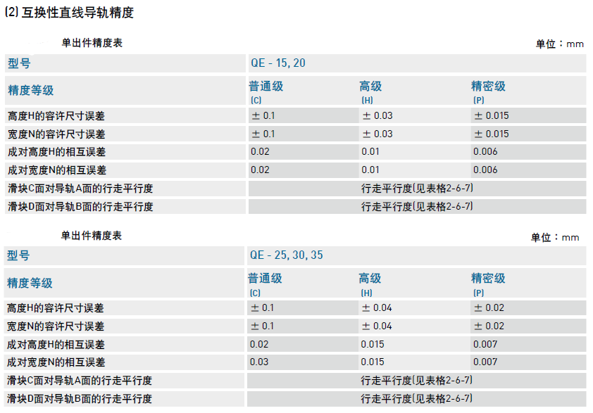 QE系列分為非互轉性及互轉性兩種線性滑軌,兩者規格尺寸相同,主要差異點在于互換性型之滑塊、滑軌可單出互換使用,較便利,但其組合精度無法連到非互換型所擁有的超高精度等級。不過由于HIWIN的制造上有良好的尺寸控制及規格的品質要求,互換性型之組合精度目前已達到一定的水準,對不需配對安裝線性滑軌的客戶而言,是一項很好的選擇。
